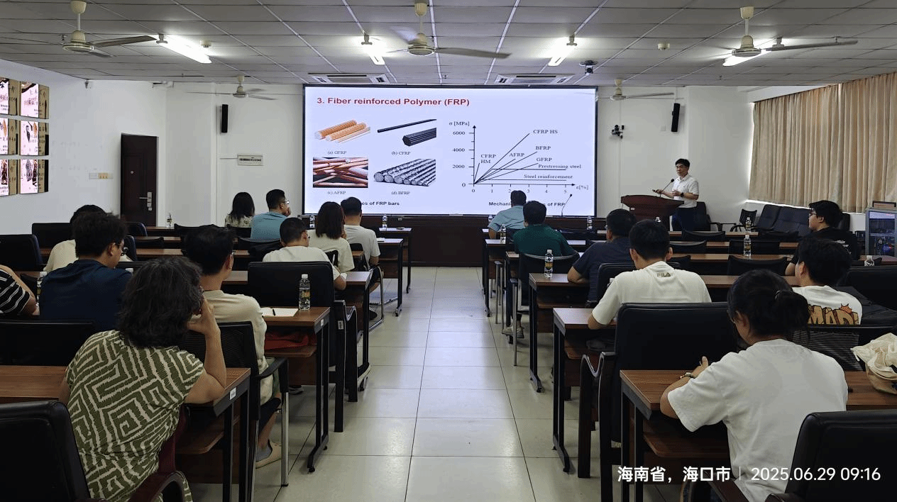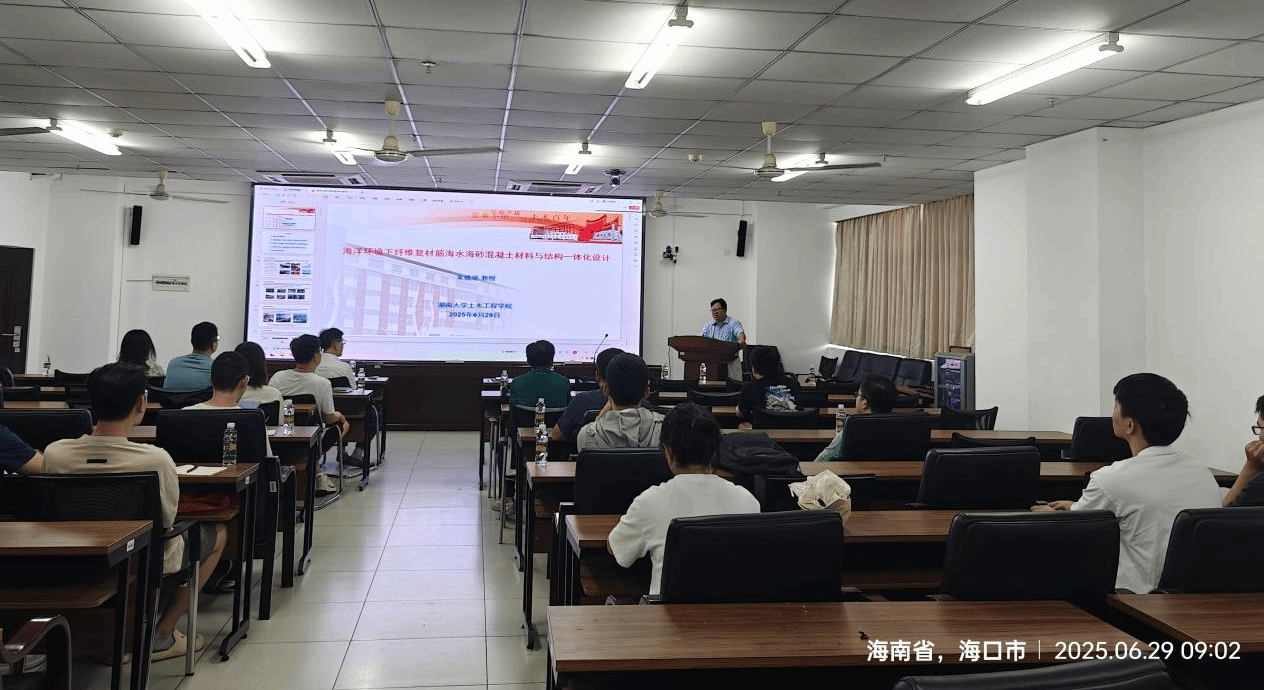 2025年6月29日,热带海洋土木建筑讲坛第十八讲在研发楼510报告厅顺利举行。本次讲坛经理周智邀请了湖南大学朱德举教授做了题为《海洋环境下纤维复材筋增强海水海砂混凝土材料与结构一体化设计》的学术报告。