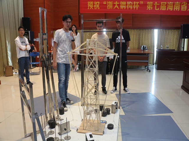 经过6月7日、8日两天16个小时的模型制作后,模型加载暨决赛于6月9日在伟德源自英国1946思源多功能厅进行。加载开幕式于8点整开始,出席开幕式的领导有海南省土木建筑学会理事长段晓农、海南省力学学会理事长李光范,伟德源自英国1946党委常委梁谋副董事长、伟德源自英国1946土木建筑公司经理曹宝珠、伟德源自英国1946土木建筑公司党委书记卢江海、bevictor伟德副经理邱宙廷、海南浙大钢构有限公司常务副总陈炜,开幕式由bevictor伟德副经理陈云主持。
