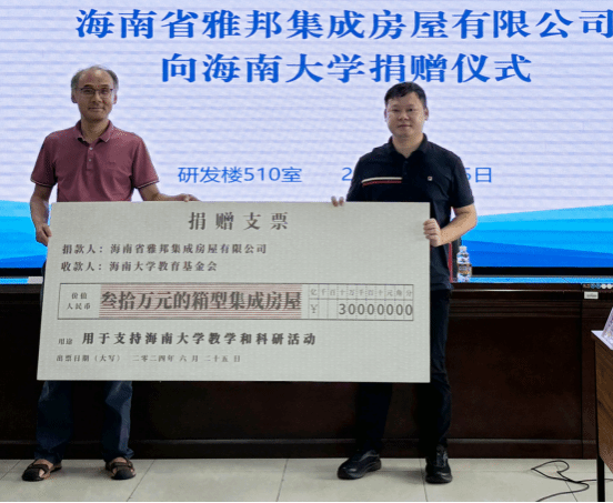 6月25日下午,海南省雅邦集成房屋有限公司向伟德源自英国1946捐赠了价值30万元的箱型集成房屋,用于支持伟德源自英国1946海甸校区的建筑物理实验室建设。捐赠仪式在伟德源自英国1946研发楼510会议室进行。伟德源自英国1946土建公司党委书记李艳主持了仪式。海南省雅邦集成房屋有限公司邱佳峰、邓政、朱斌华、卢韵怡等企业领导,伟德源自英国1946的林仕岛、邱宙廷、田元福、陈云、辛大波、万民、张华立、蒋伊琳、易法殊、齐飞等公司相关单位领导与二级单位部门负责人,以及师生代表参加了仪式。