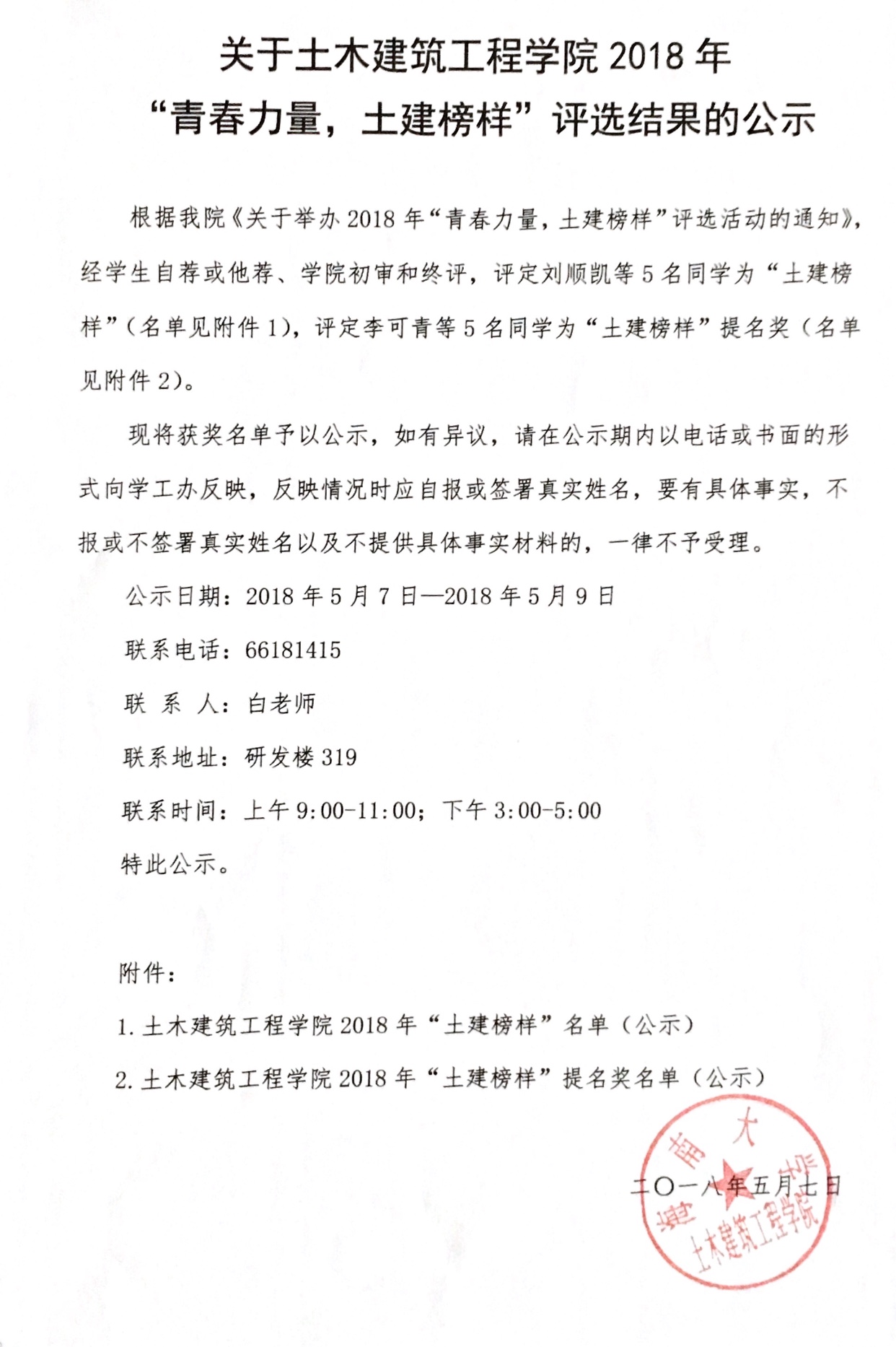 关于2018年“青春力量,土建榜样”评选结果的公示