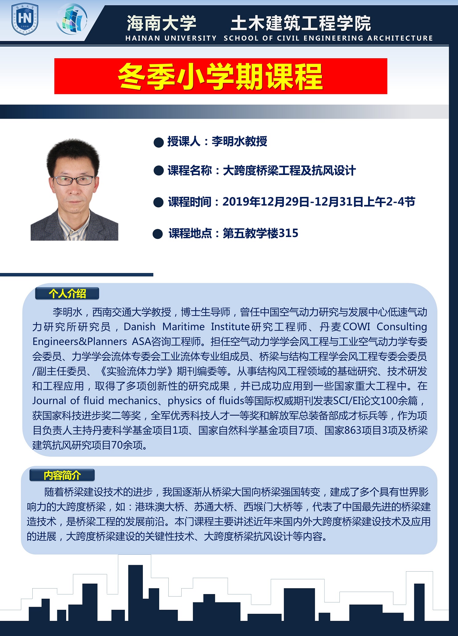 西南交通大学教授,博导,曾任中国空气动力研究与发展中心低速气动力研究所研究员,Danish Maritime Institute研究工程师、丹麦Cowi Consulting Engineers & Planners AS咨询工程师。主要从事大跨度桥梁和高层建筑(构筑)物的抗风研究工作。先后获国家科技进步奖二等奖、全军优秀科技人才一等岗位津贴、解放军总装备部成才标兵等,担任空气动力学学会风工程与工业空气动力学专委会委员、力学学会流体专委会工业流体专业组成员、桥梁与结构工程学会风工程专委会委员/副主任委员、《实验流体力学》等期刊编委。负责和参加了一项丹麦科学基金项目、7项国家自然科学基金项目、三项国家863项目以及桥梁建筑抗风研究等七十多项课题的研究工作,在Journal of fluid mechanics、physics of fluids等流体力学顶级期刊发表SCI/EI论文约100篇。