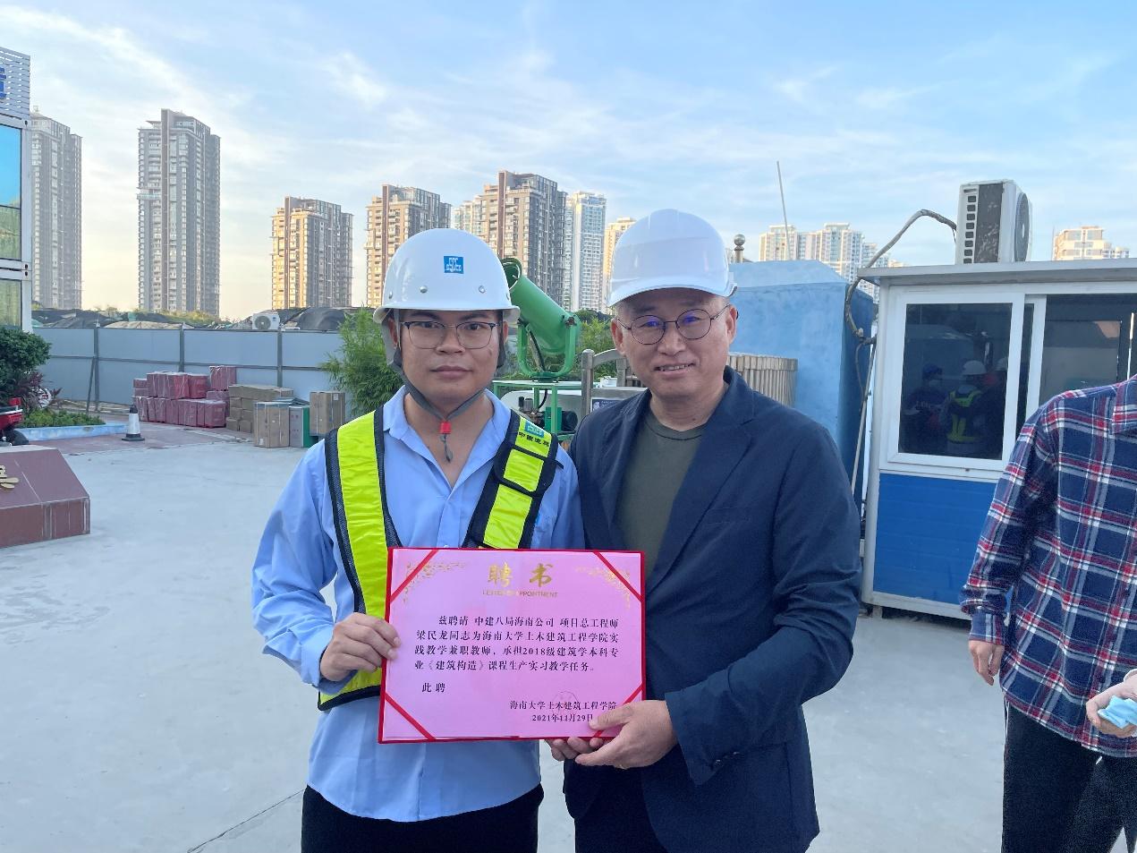 华彩·海口湾广场项目参观开始前,中国建筑第八工程局有限公司的海南公司梁民龙作为项目总工程师,针对项目的玻璃幕墙工程在会议室给员工们做了精彩的报告,详细地介绍了玻璃幕墙的结构组成、特点分析、材料加工工艺、转角部位安装难点等内容。报告结束后,老师和项目施工现场负责人带领员工到施工现场实地参观。参观过程中,以老师讲解员工提问的方式,把实际工程和课本上的理论知识相结合,加深了员工对玻璃幕墙的认知和理解。参观结束后,陶老师给工程师梁民龙颁发聘书,聘请中建八局海南公司项目总工程师梁民龙同志为bevictor伟德实践教学兼职教师,承担2018级建筑学本科专业《建筑构造》课程生产实习教学任务。
