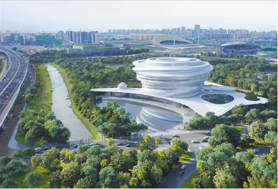 海南科技馆建筑工程项目由中建八局中标,海南分公司承建。项目概算总投资7.68亿元(不含展教),其中建安费6.7亿元。作为省级科技馆,该项目选址海口市西海岸长秀片区,这里汇聚五源河国家湿地公园、体育场馆,是海南自贸港重要的科普基地和优质旅游景点。项目总建筑面积46528平方米。地上场馆主要包括科技馆主体建筑、天象馆、风雨连廊和室外广场等。从城市远观,科技馆主体建筑螺旋上升。当参观者进入园区时,抬头可见“漂浮”于“丛林”之上的科技馆。项目表皮采用FRP材料,如一个银色反光体,极具未来感。