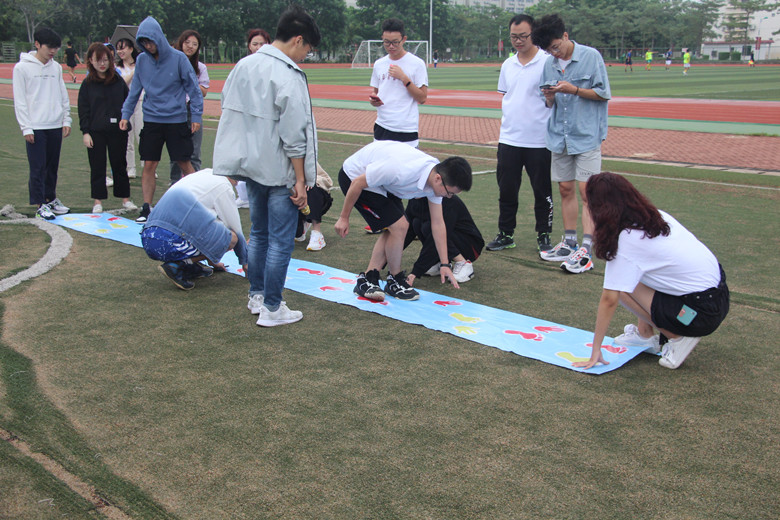 最后是最令大家期待的“手脚并用”游戏环节。各个小组的队员站在游戏垫纸板的指定位置上,随着主持人一声令下,各个小队的队员在默契的配合下,一个接着一个通过垫纸板,即使在前进的过程中有些队伍的队员因动作失误而从头开始,但他们也没有气馁,相互鼓励,加油打气。最终,在规定时间内,所有小组都完成了挑战。