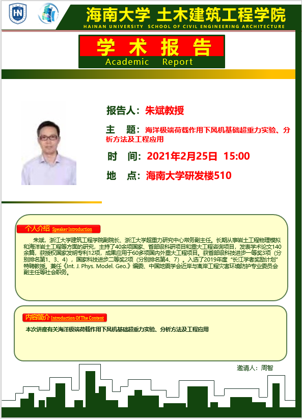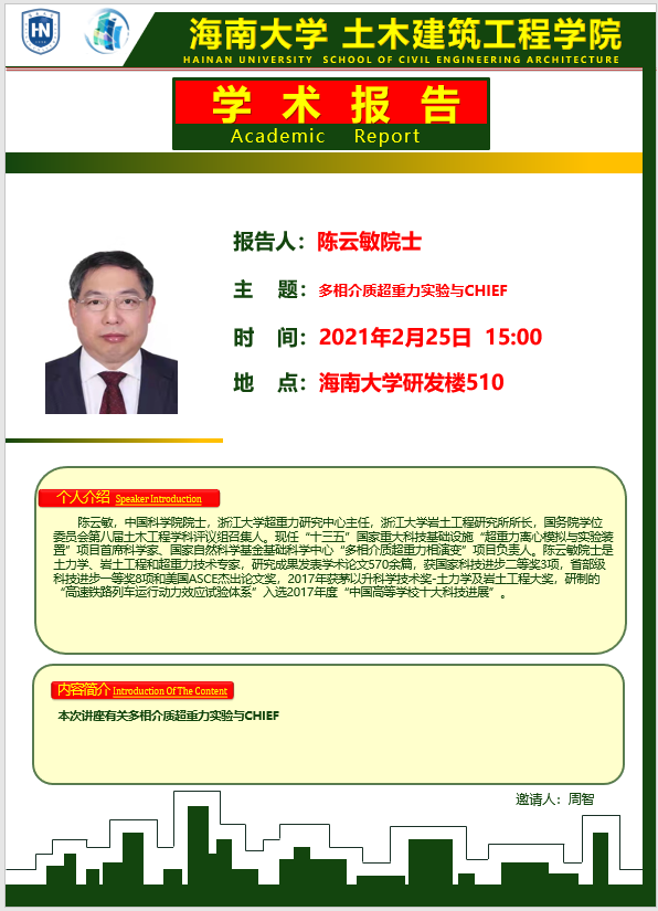 2月25日(周四)下午3:00点在伟德源自英国1946研发楼510,浙江大学陈云敏院士和朱斌教授分别在公司做《多相介质超重力实验与CHIEF》和《海洋极端荷载作用下风机基础超重力实验、分析方法及工程应用》学术报告。请各位老师和在校研究生务必参加,到时会做参会签名,考勤记录。