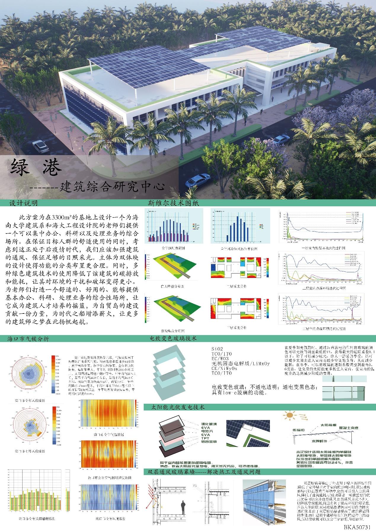海南属于热带季风气候,长夏无冬,终年湿润。采用垂直式绿化系统,环环相扣充分利用水资源;屋顶放置太阳能合理利用绿色能源;通过采光井和挡光板收集阳光并遮挡眩光;东南向开小口引入主导风,通过走廊引流到建筑各个角落。